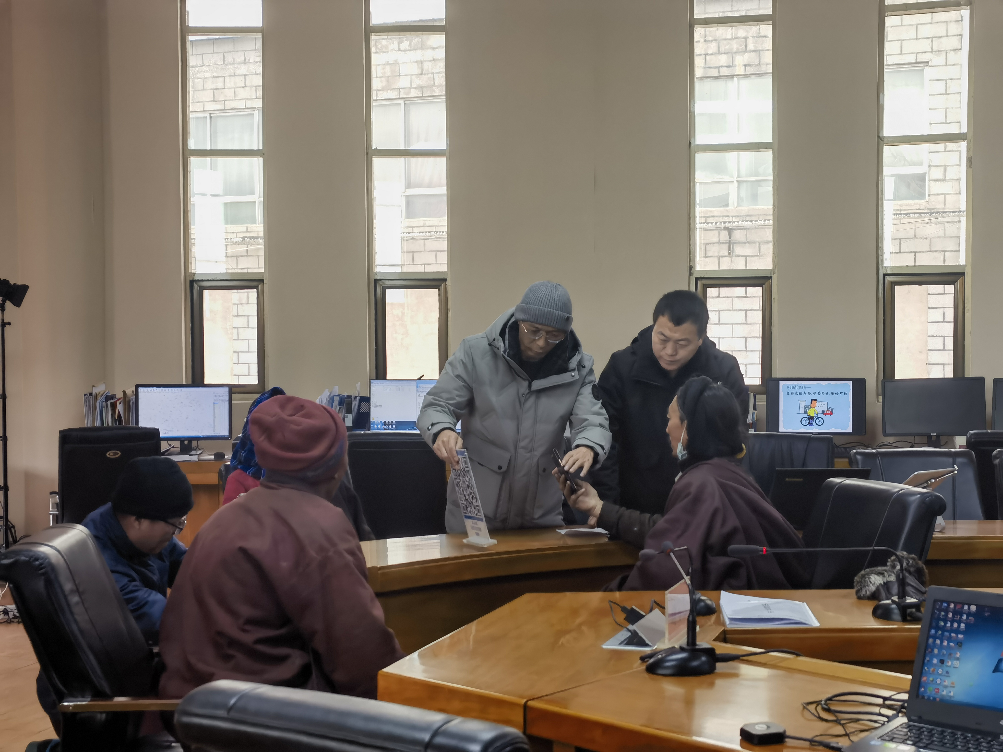 图为:气象台工作人员为前来办理气象灾害证明的群众讲解网上办理流程